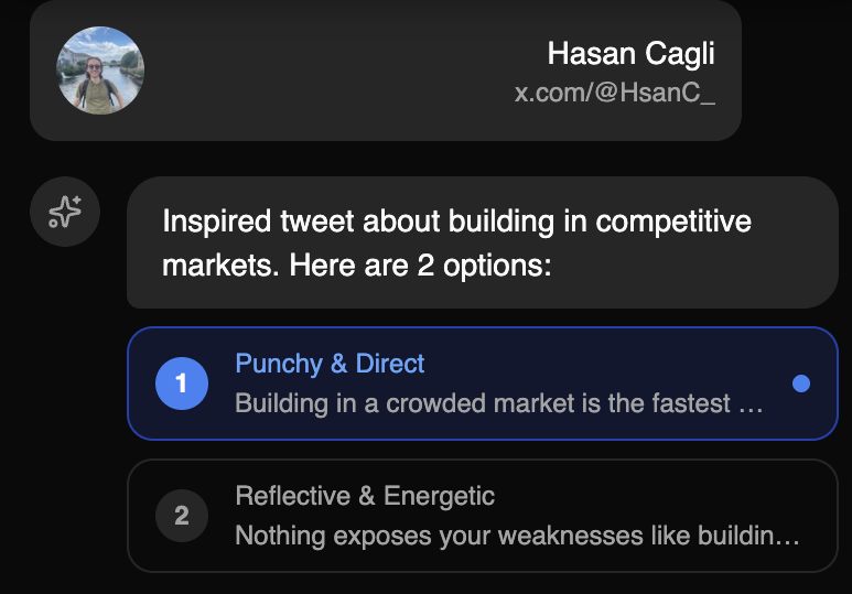 A copilot that actually knows you. It replies like you, tweets like you — but better. Grow fast while you focus on building.